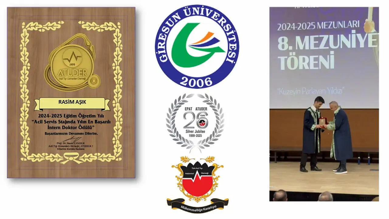 Giresun Üniversitesi Tıp Fakültesinin 27 Haziran 2025 tarihinde yapılan mezuniyet töreninde, 2024 - 2025 eğitim öğretim yılında “ Acil servis stajında en başarılı intern doktor ” ödülümüze layık görülen Dr. Rasim AŞIK'a belgesi ve plaketini Acil Tıp Ana Bilim Dalı Acil Tıp Ana Bilim Dalı Öğretim Üyesi Dr. Öğrt. Üyesi Mehmet EKİZ takdim edildi.